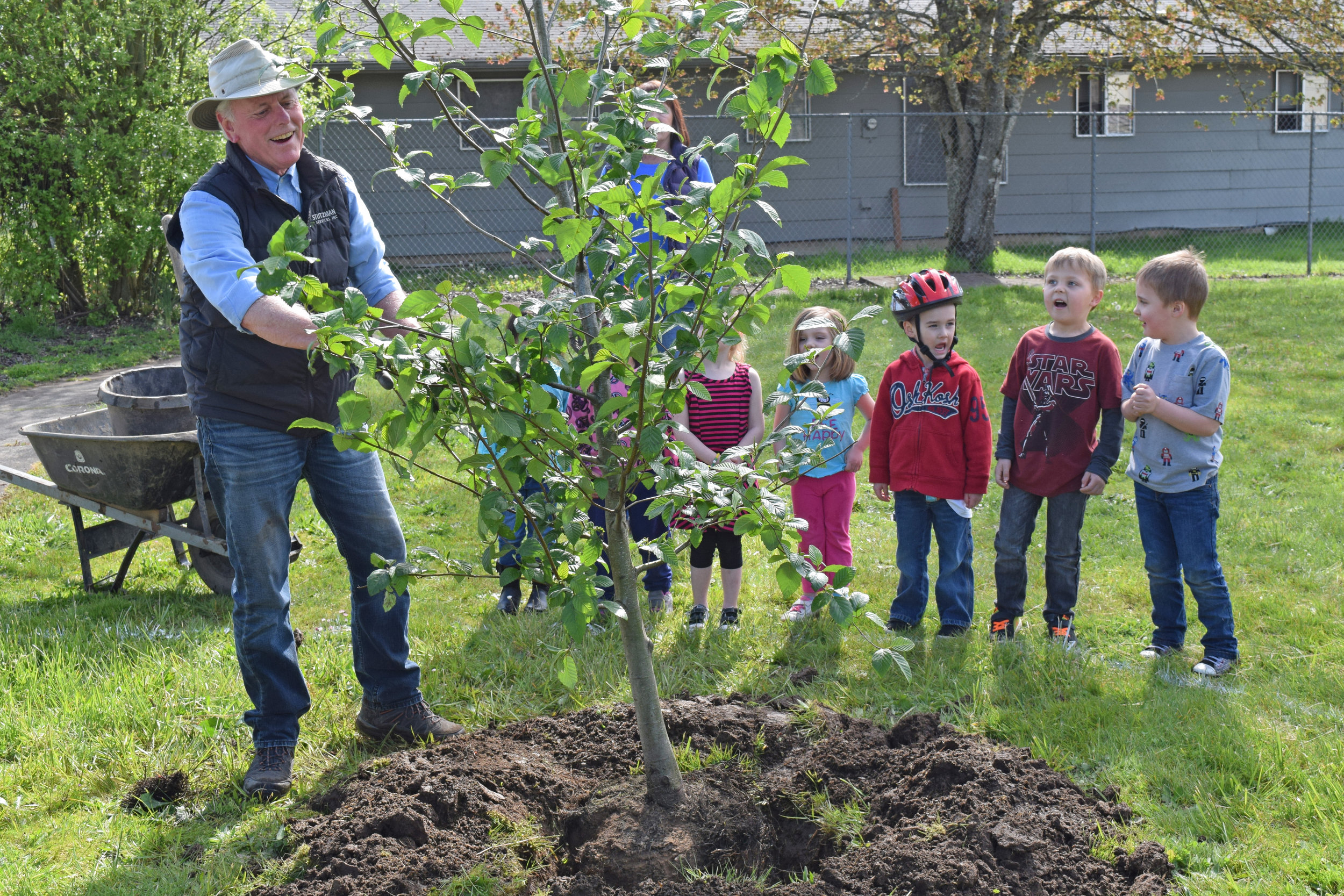 The Child Development Center at Waverly Elementary School received a special gift on Friday. With the help of some eager preschoolers, Landscape Designer Bill Marshall of Stutzman Services planted a donated red alder tree in the school’s playground.